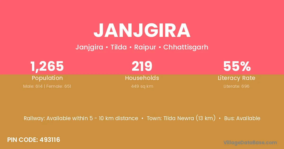 Janjgira village has a total population of 1,265 people, of which 614 are males and 651 are females.