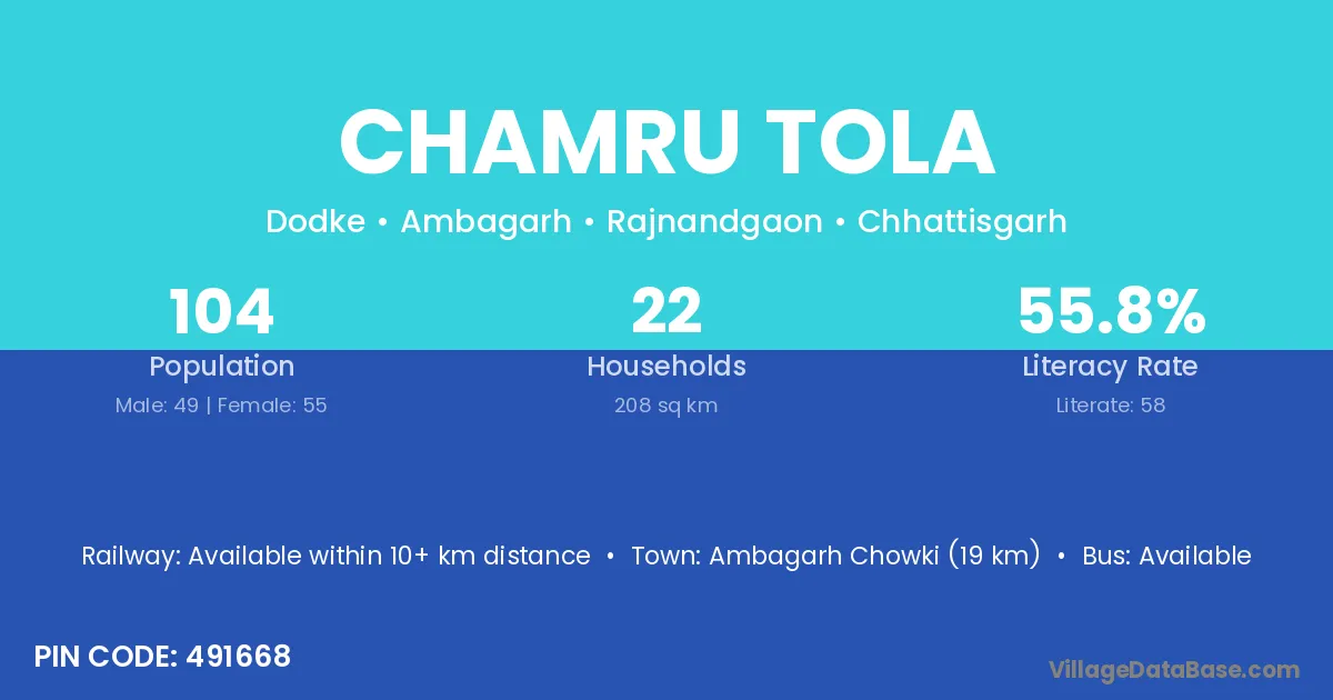 Ambagarh Chowki (19 km) is the nearest town to Chamru Tola village for major economic activities and is located approximately 19 km away.