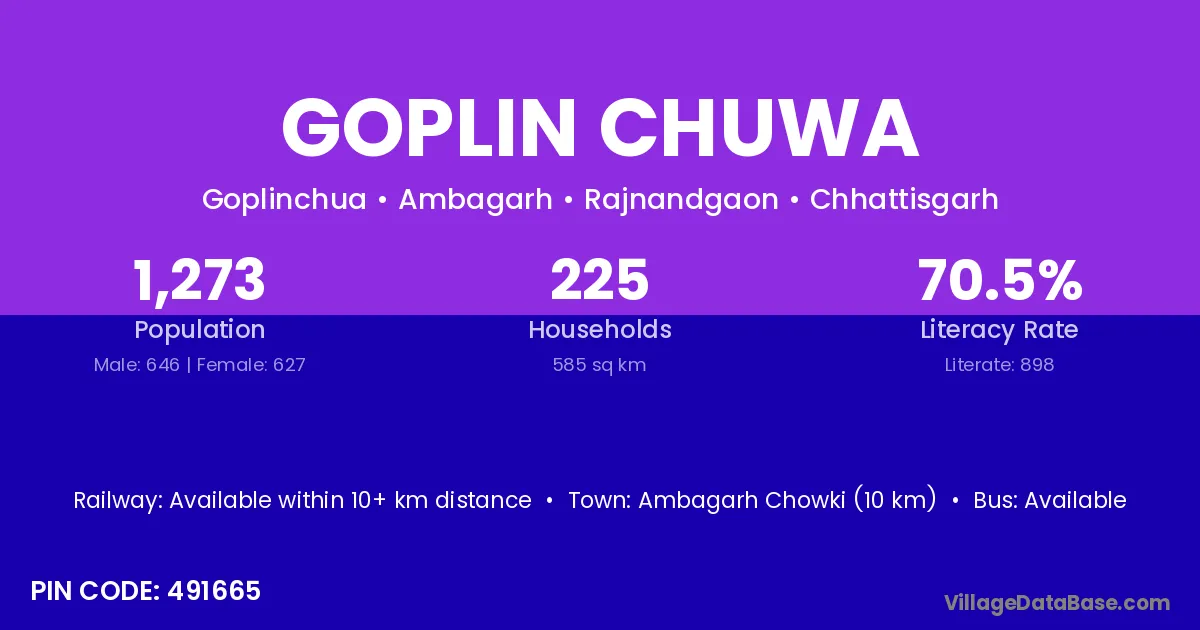 Ambagarh Chowki (10 km) is the nearest town to Goplin Chuwa village for major economic activities and is located approximately 10 km away.