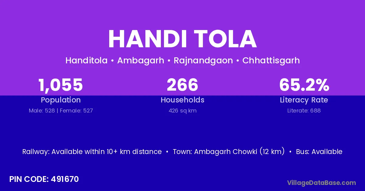Handi Tola village has a total population of 1,055 people, of which 528 are males and 527 are females.