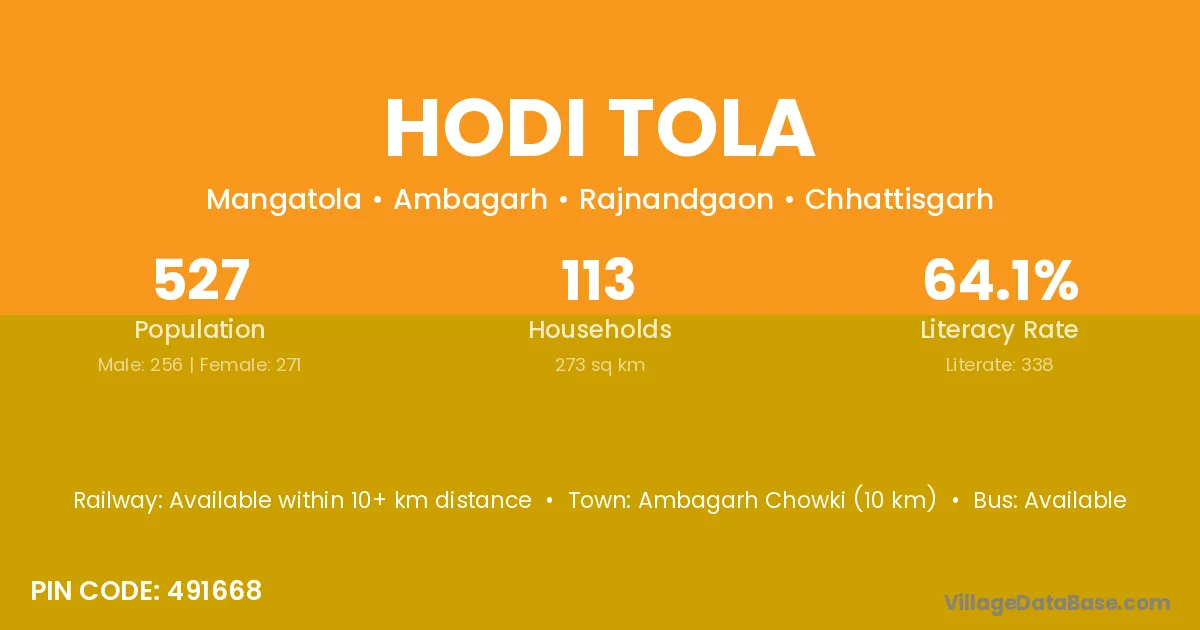Ambagarh Chowki (10 km) is the nearest town to Hodi Tola village for major economic activities and is located approximately 10 km away.