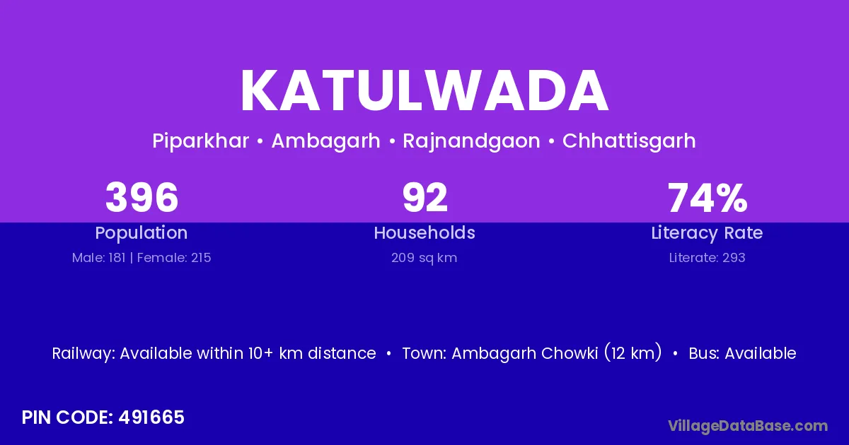 Ambagarh Chowki (12 km) is the nearest town to Katulwada village for major economic activities and is located approximately 12 km away.