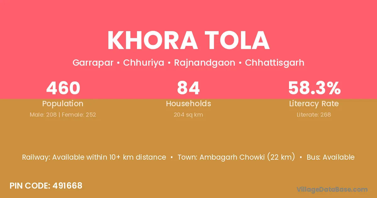 Ambagarh Chowki (16 km) is the nearest town to Khora Tola village for major economic activities and is located approximately 16 km away.