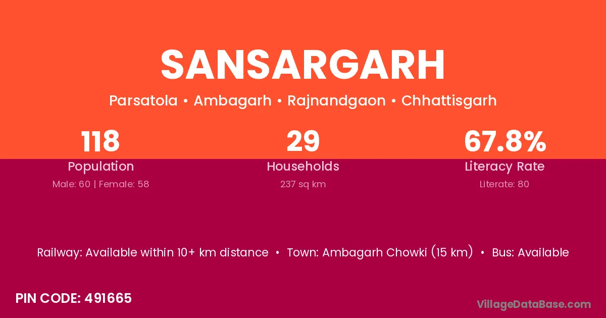 Sansargarh village has a total population of 118 people, of which 60 are males and 58 are females.