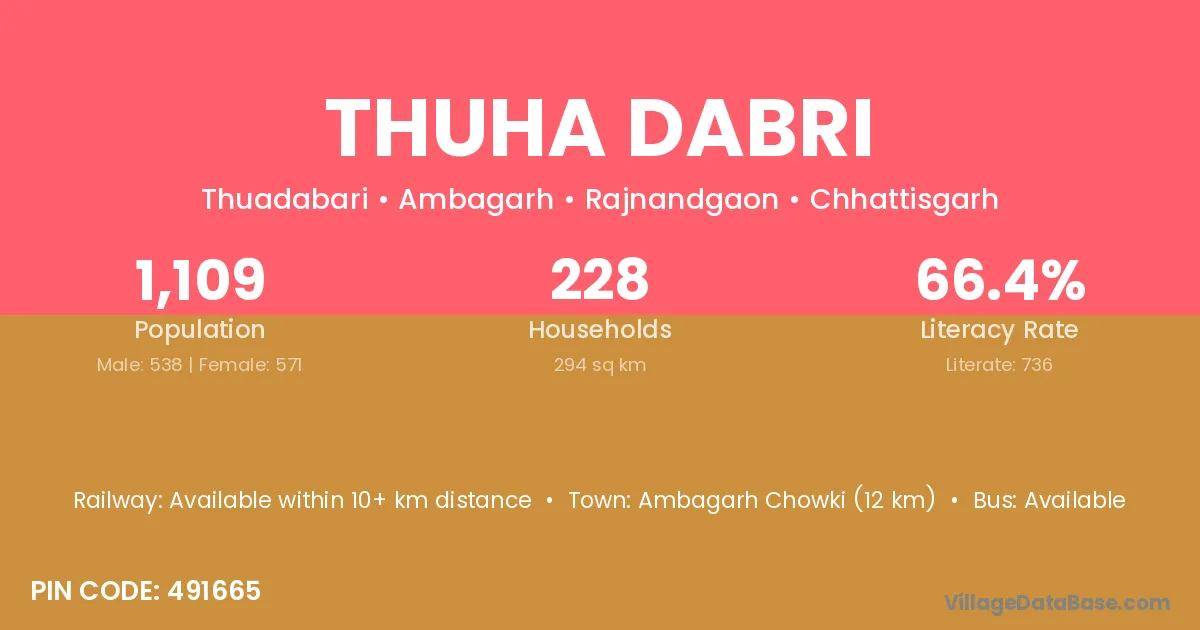 Ambagarh Chowki (12 km) is the nearest town to Thuha Dabri village for major economic activities and is located approximately 12 km away.