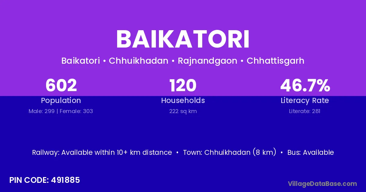 Chhuikhadan (8 km) is the nearest town to Baikatori village for major economic activities and is located approximately 8 km away.