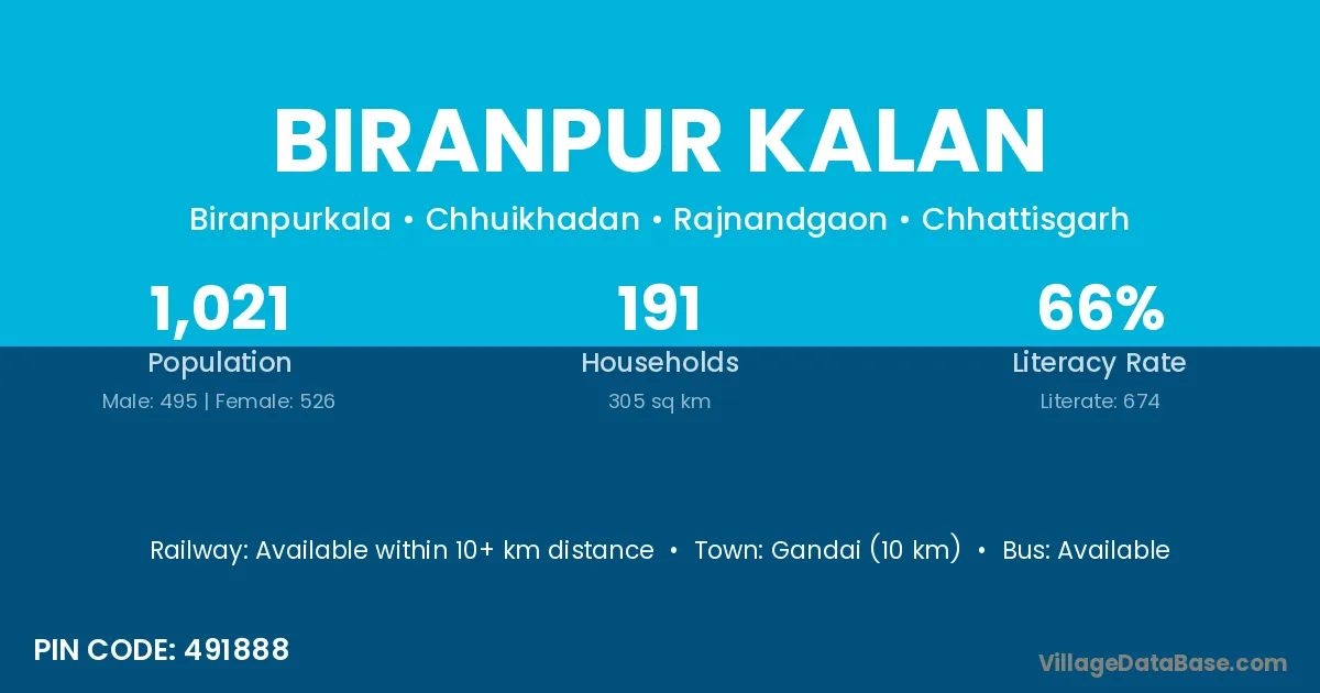 Biranpur Kalan village is located in the Chhuikhadan Tehsil of the Rajnandgaon district in Chhattisgarh .