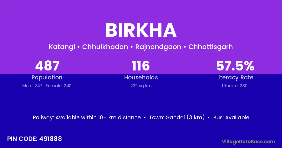 Birkha village is located in the Chhuikhadan Tehsil of the Rajnandgaon district in Chhattisgarh .