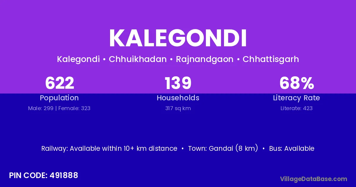 Kalegondi village has a total population of 622 people, of which 299 are males and 323 are females.