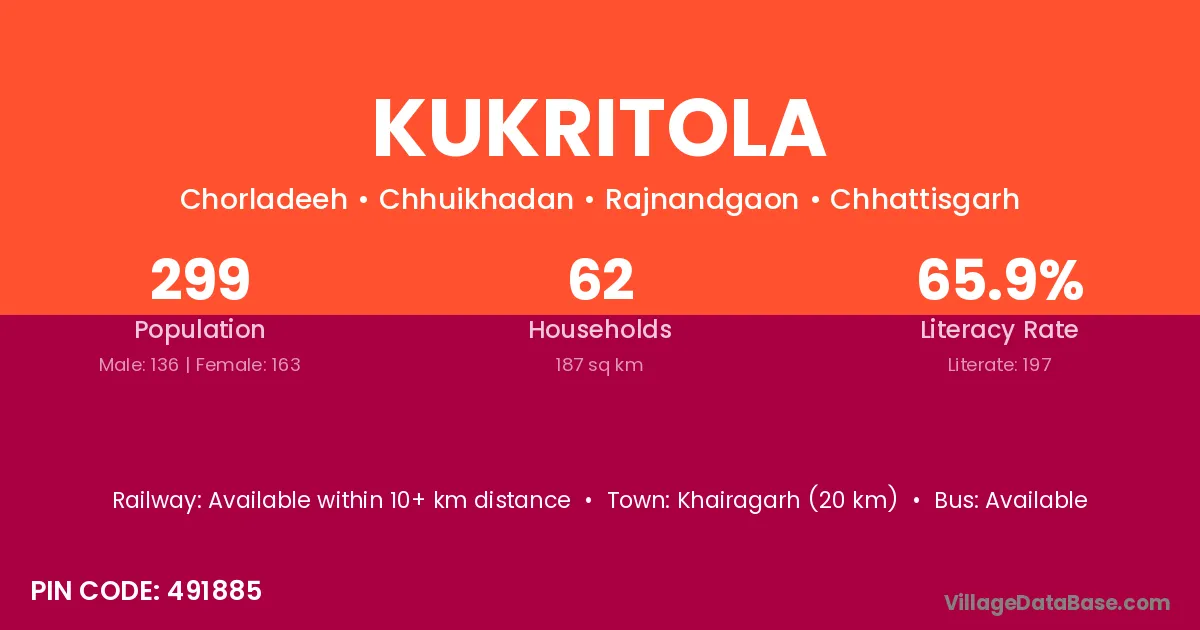 Khairagarh (20 km) is the nearest town to Kukritola village for major economic activities and is located approximately 20 km away.