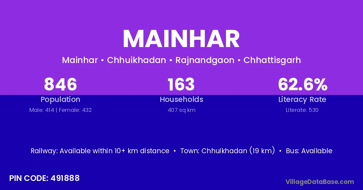 Chhuikhadan (19 km) is the nearest town to Mainhar village for major economic activities and is located approximately 19 km away.
