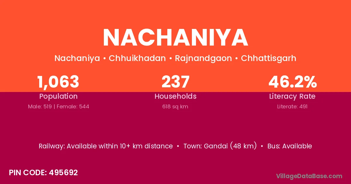 Nachaniya village has a total population of 1,063 people, of which 519 are males and 544 are females.