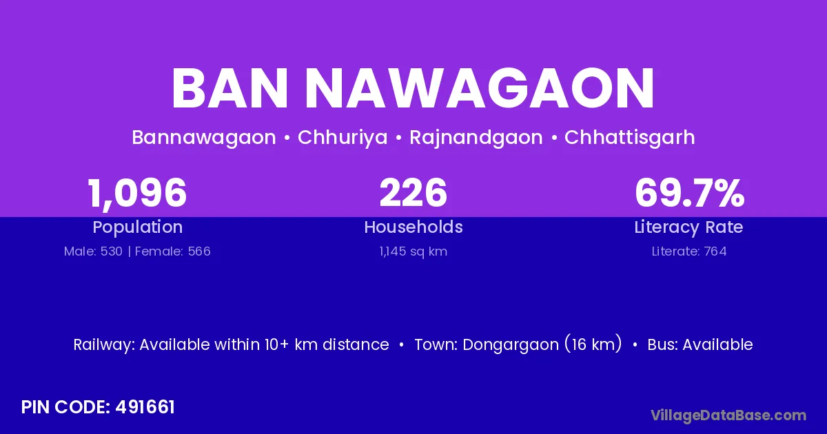 Dongargaon (16 km) is the nearest town to Ban Nawagaon village for major economic activities and is located approximately 16 km away.