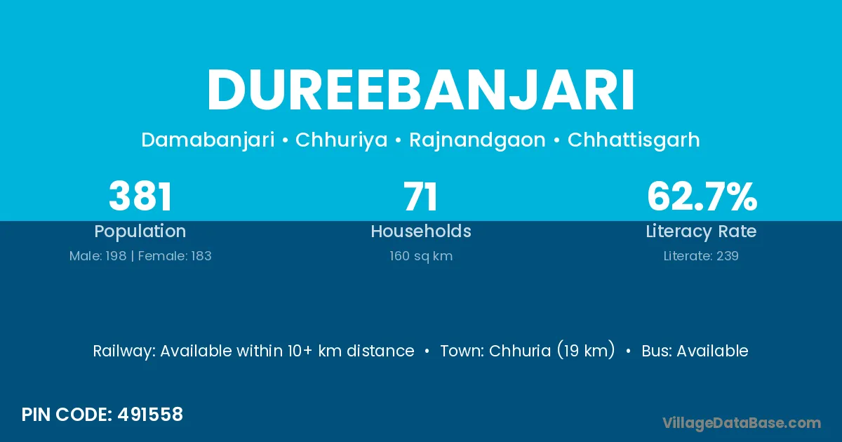 Chhuria (19 km) is the nearest town to Dureebanjari village for major economic activities and is located approximately 19 km away.