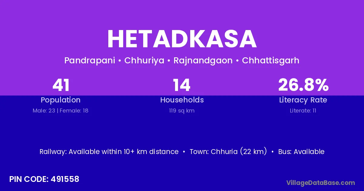 Hetadkasa village has a total population of 41 people, of which 23 are males and 18 are females.