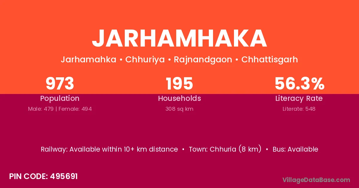 Chhuria (8 km) is the nearest town to Jarhamhaka village for major economic activities and is located approximately 8 km away.