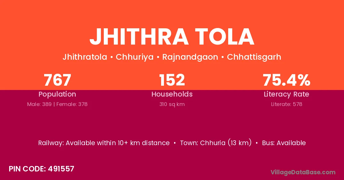 Chhuria (13 km) is the nearest town to Jhithra Tola village for major economic activities and is located approximately 13 km away.