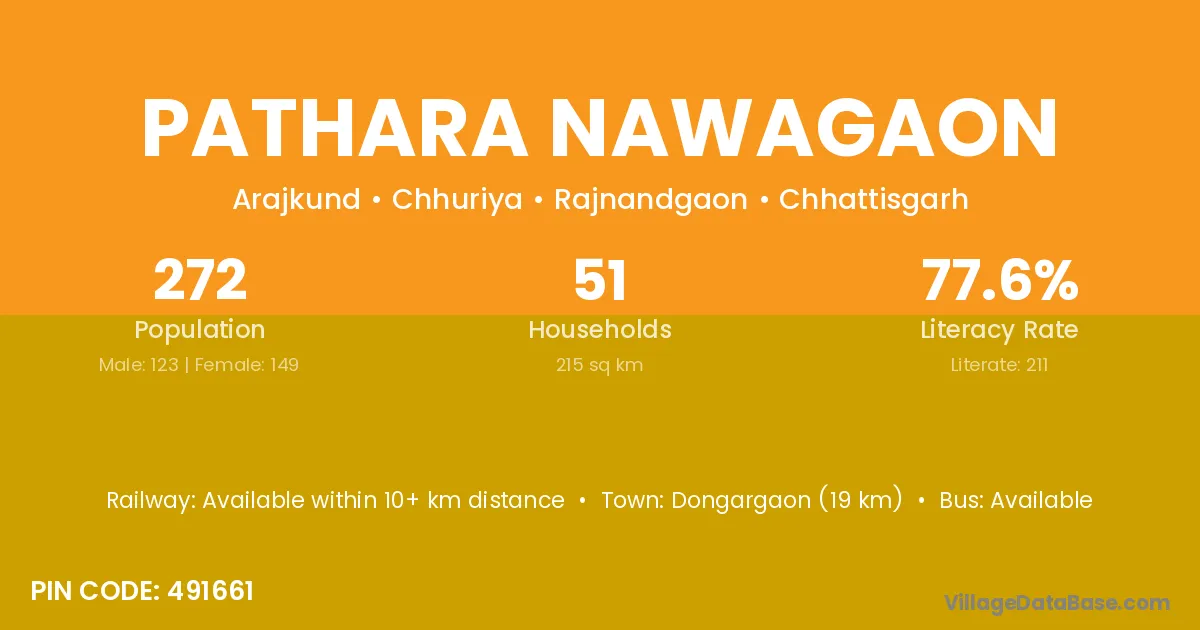 Dongargaon (19 km) is the nearest town to Pathara Nawagaon village for major economic activities and is located approximately 19 km away.