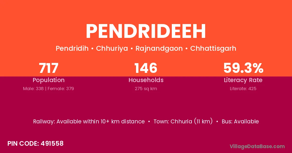 Chhuria (11 km) is the nearest town to Pendrideeh village for major economic activities and is located approximately 11 km away.