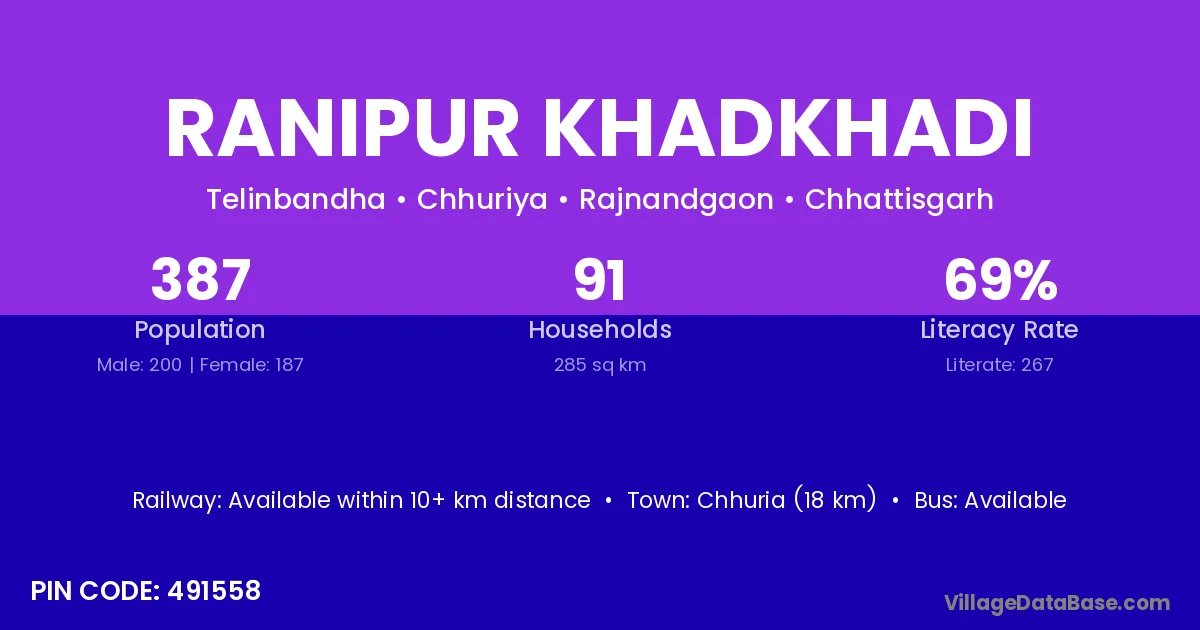 Chhuria (18 km) is the nearest town to Ranipur Khadkhadi village for major economic activities and is located approximately 18 km away.