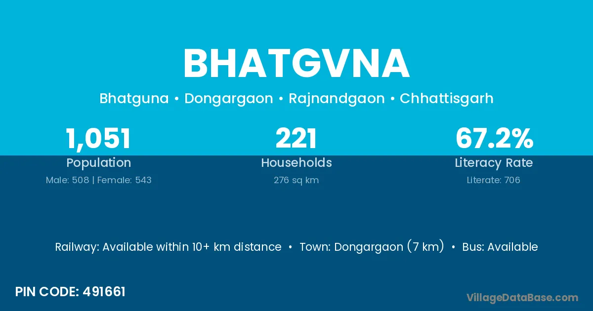 Bhatgvna village has a total population of 1,051 people, of which 508 are males and 543 are females.