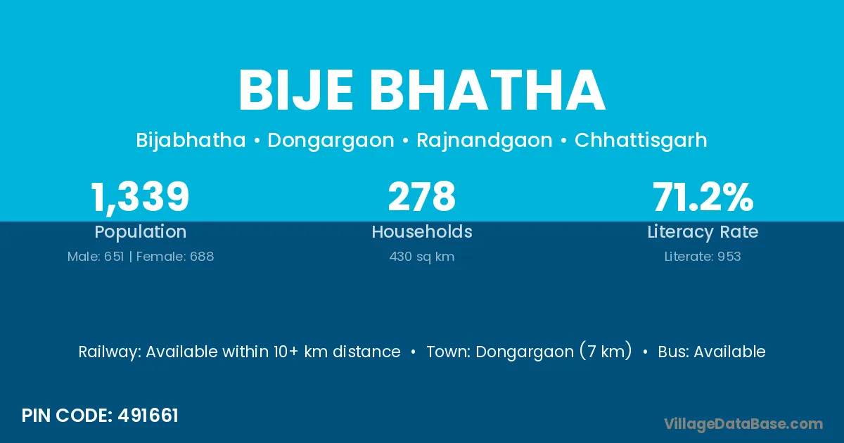 Dongargaon (7 km) is the nearest town to Bije Bhatha village for major economic activities and is located approximately 7 km away.