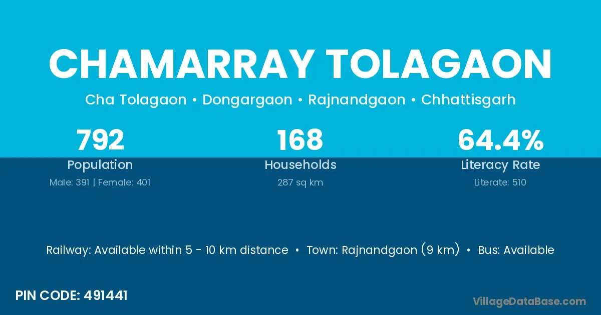 Rajnandgaon (9 km) is the nearest town to Chamarray Tolagaon village for major economic activities and is located approximately 9 km away.