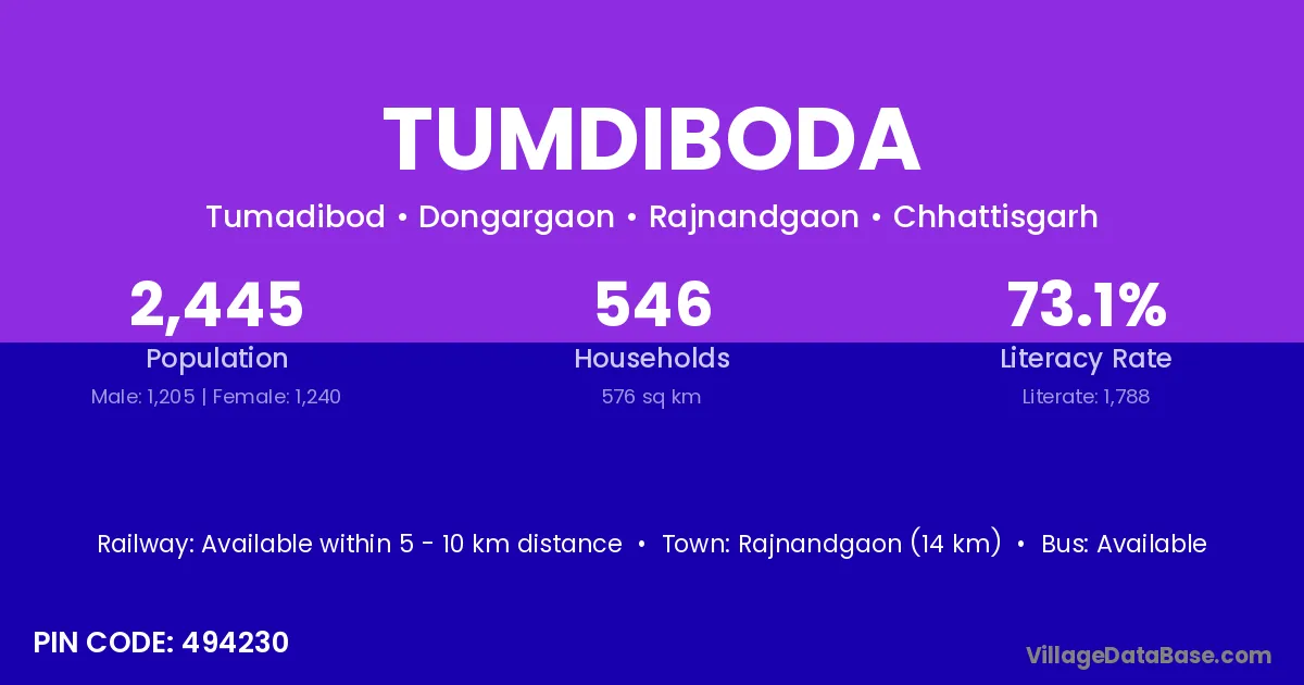 Rajnandgaon (14 km) is the nearest town to Tumdiboda village for major economic activities and is located approximately 14 km away.