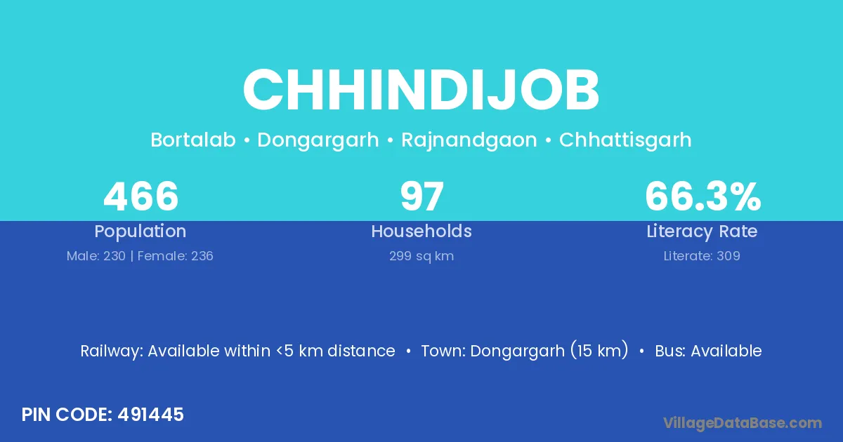 Dongargarh (15 km) is the nearest town to Chhindijob village for major economic activities and is located approximately 15 km away.
