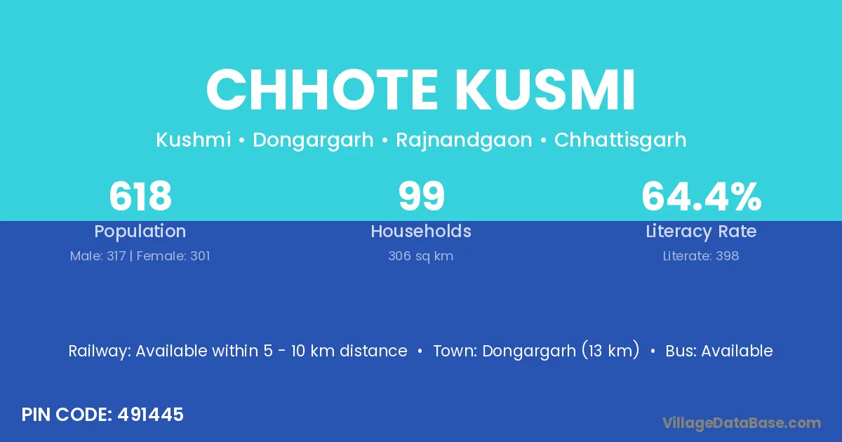 Dongargarh (13 km) is the nearest town to Chhote Kusmi village for major economic activities and is located approximately 13 km away.