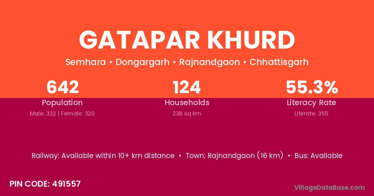 Rajnandgaon (16 km) is the nearest town to Gatapar Khurd village for major economic activities and is located approximately 16 km away.