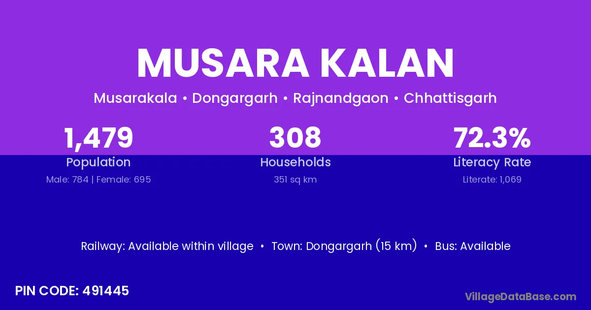 Dongargarh (15 km) is the nearest town to Musara Kalan village for major economic activities and is located approximately 15 km away.