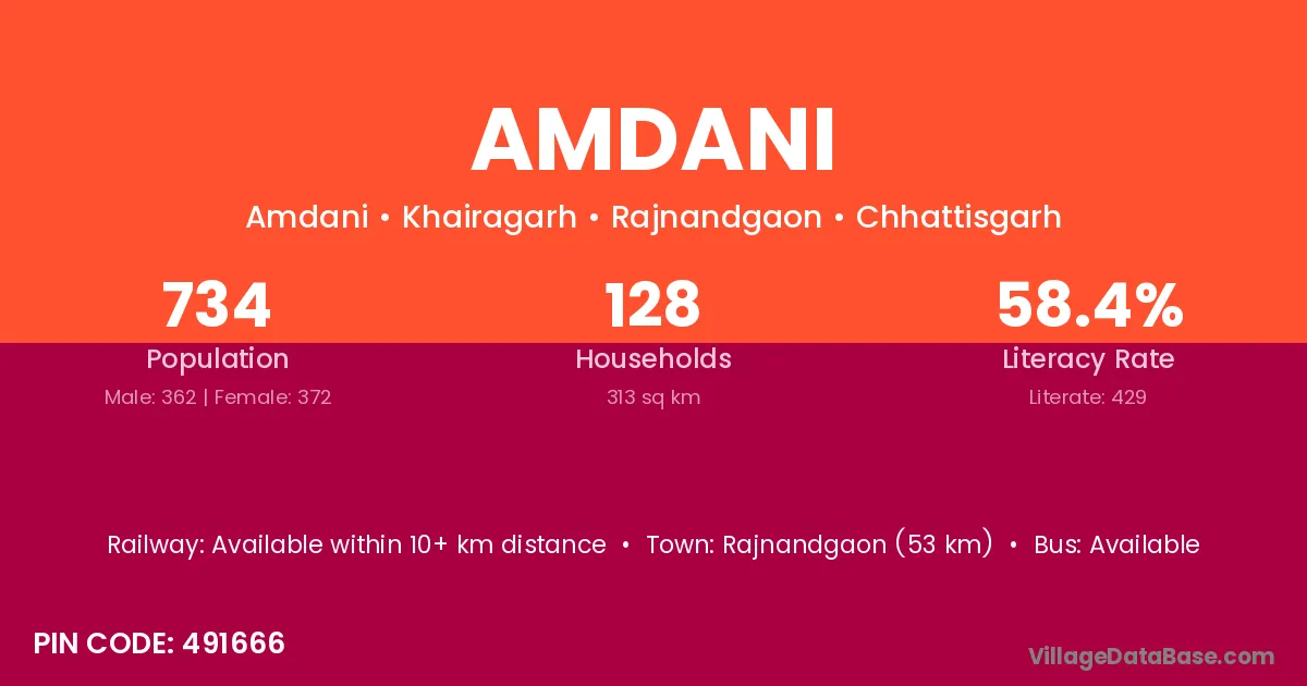 Rajnandgaon (53 km) is the nearest town to Amdani village for major economic activities and is located approximately 53 km away.