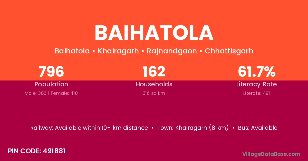 Khairagarh (8 km) is the nearest town to Baihatola village for major economic activities and is located approximately 8 km away.