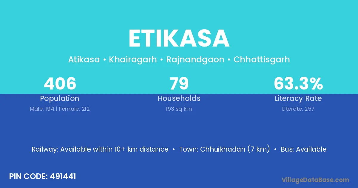 Chhuikhadan (7 km) is the nearest town to Etikasa village for major economic activities and is located approximately 7 km away.