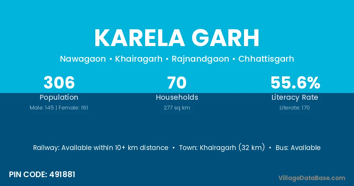 Khairagarh (32 km) is the nearest town to Karela Garh village for major economic activities and is located approximately 32 km away.