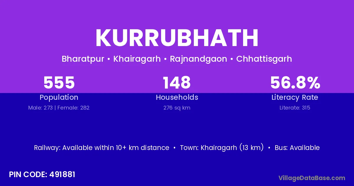 Khairagarh (13 km) is the nearest town to Kurrubhath village for major economic activities and is located approximately 13 km away.