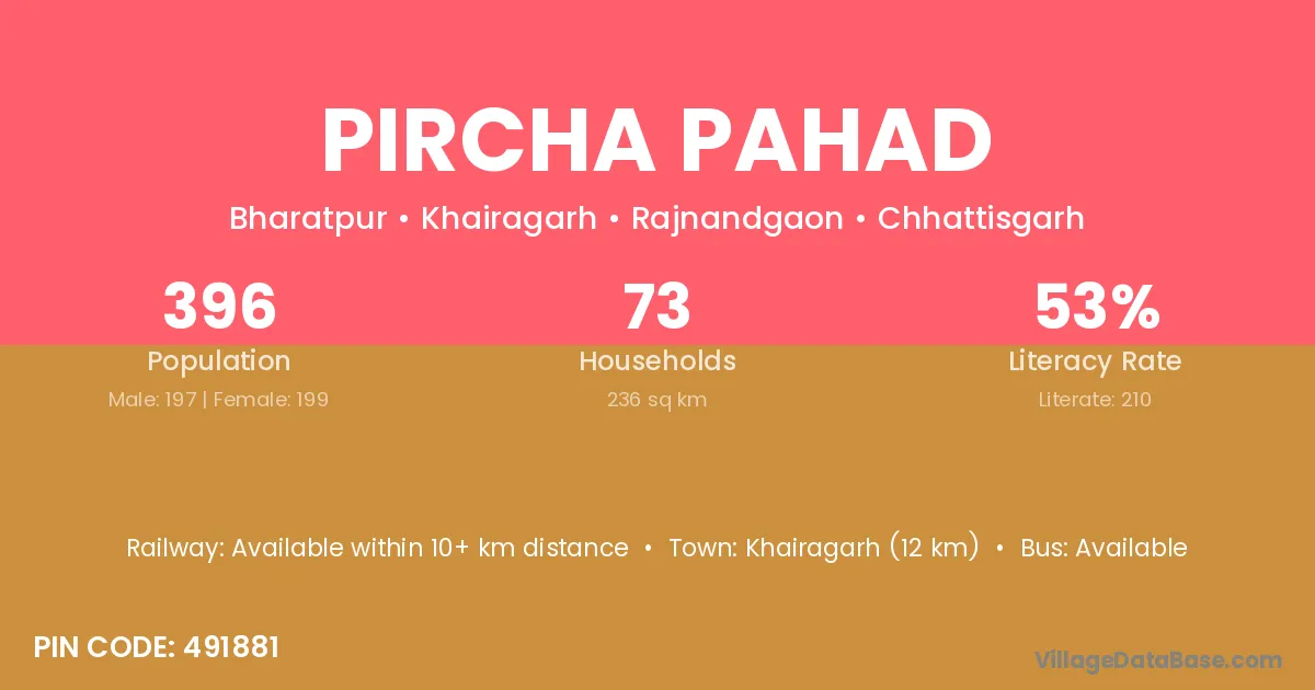 Khairagarh (12 km) is the nearest town to Pircha Pahad village for major economic activities and is located approximately 12 km away.