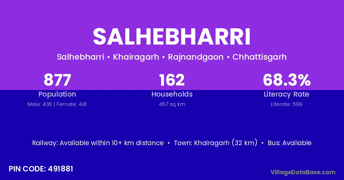 Khairagarh (32 km) is the nearest town to Salhebharri village for major economic activities and is located approximately 32 km away.