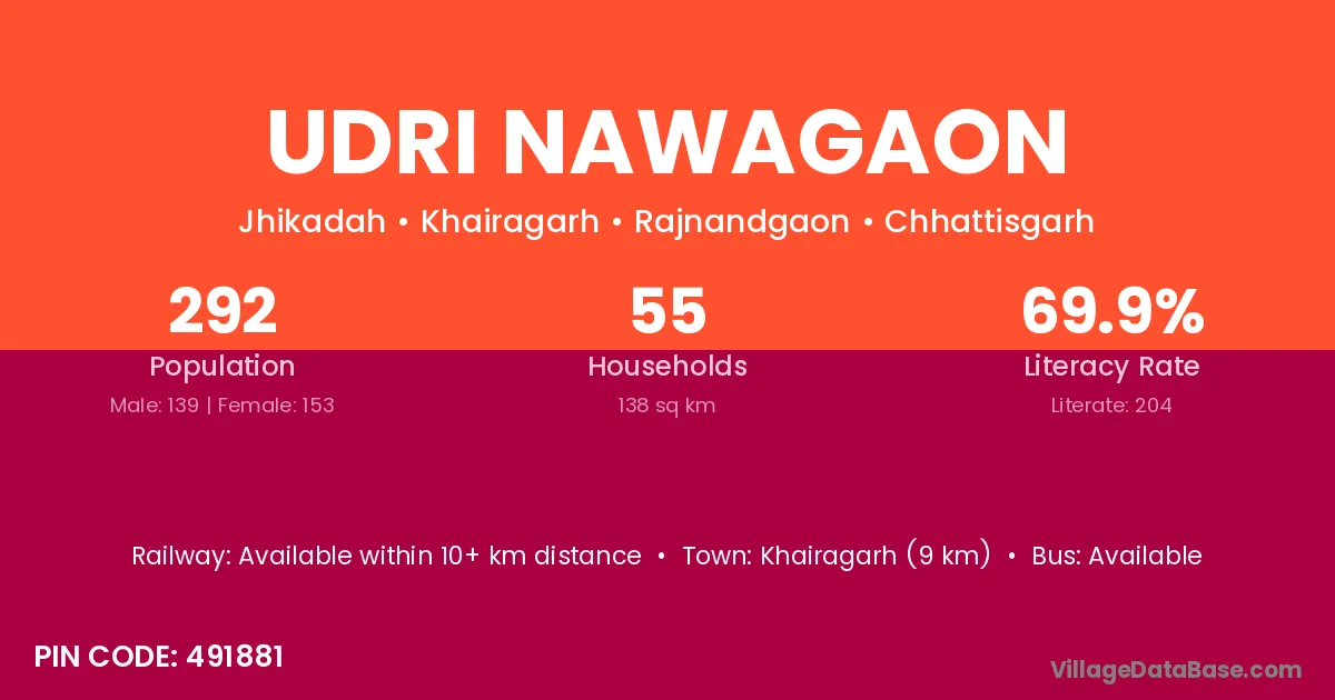 Khairagarh (9 km) is the nearest town to Udri Nawagaon village for major economic activities and is located approximately 9 km away.