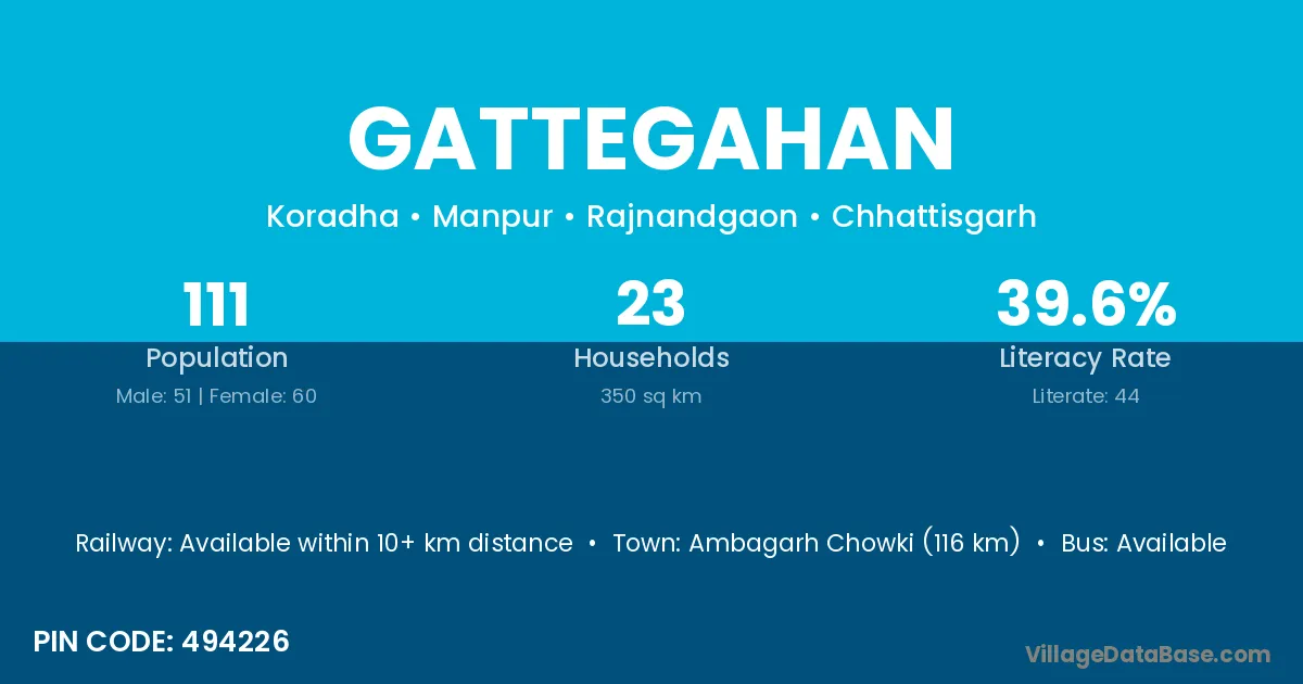 Ambagarh Chowki (116 km) is the nearest town to Gattegahan village for major economic activities and is located approximately 116 km away.
