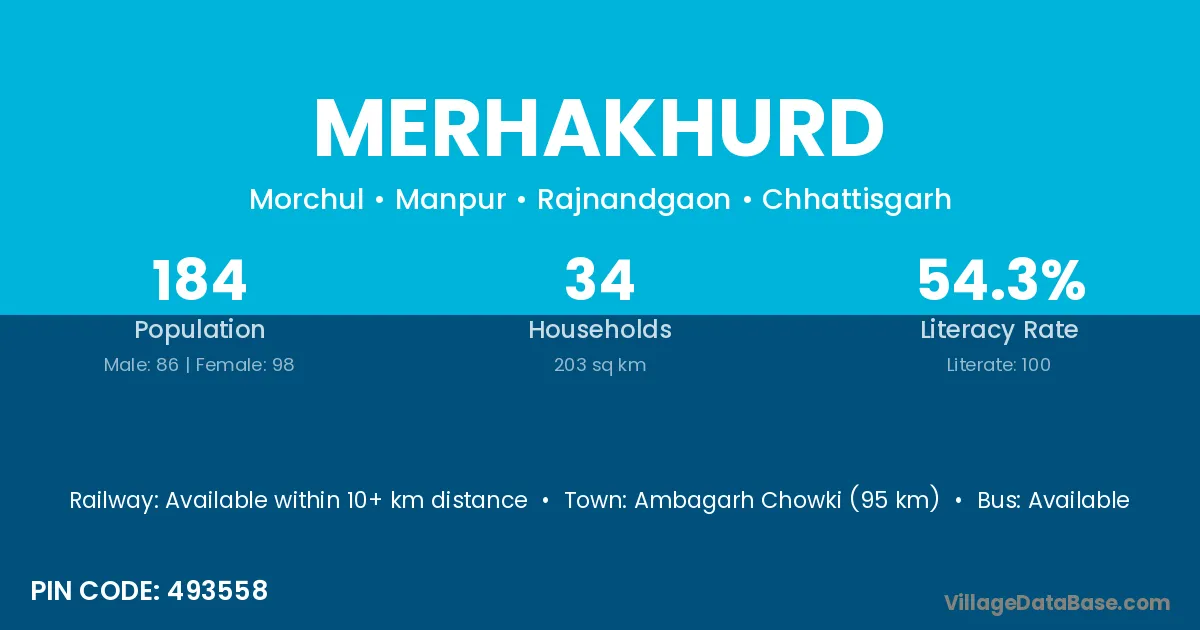Ambagarh Chowki (95 km) is the nearest town to Merhakhurd village for major economic activities and is located approximately 95 km away.