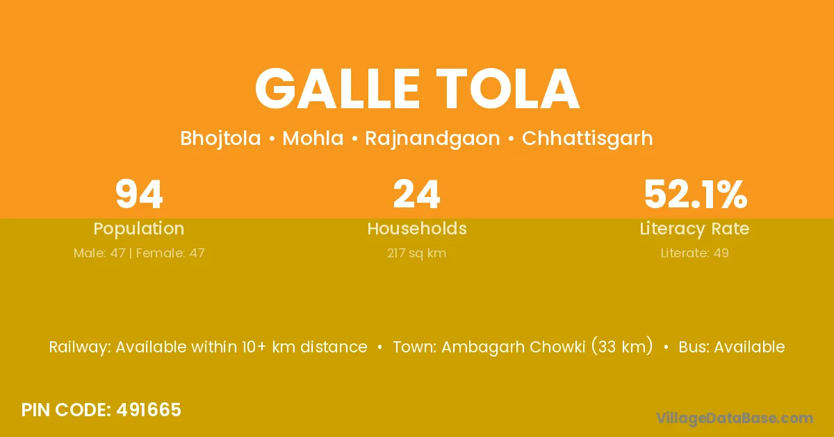 Galle Tola village has a total population of 94 people, of which 47 are males and 47 are females.