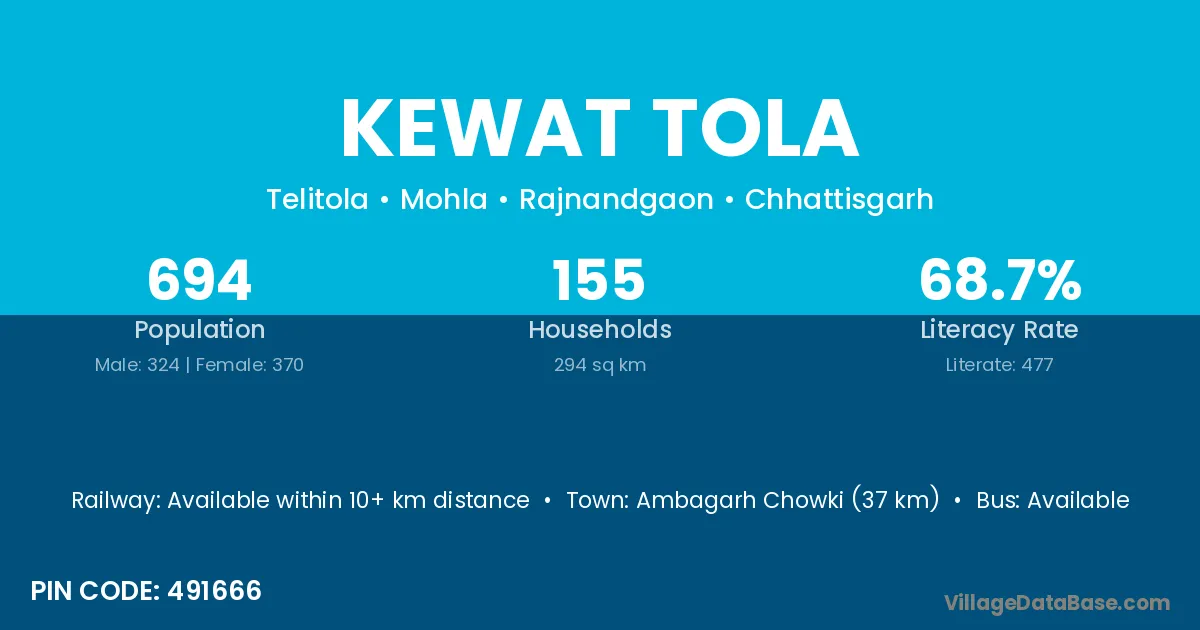 Ambagarh Chowki (37 km) is the nearest town to Kewat Tola village for major economic activities and is located approximately 37 km away.