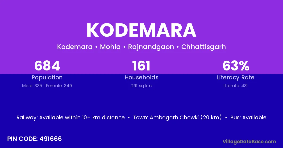 Ambagarh Chowki (20 km) is the nearest town to Kodemara village for major economic activities and is located approximately 20 km away.