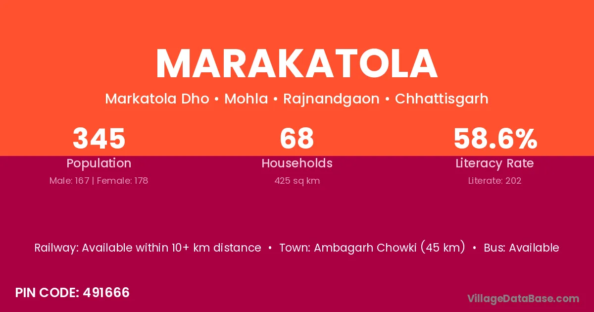 Ambagarh Chowki (45 km) is the nearest town to Marakatola village for major economic activities and is located approximately 45 km away.