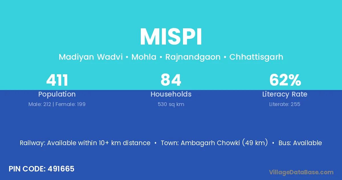 Ambagarh Chowki (49 km) is the nearest town to Mispi village for major economic activities and is located approximately 49 km away.