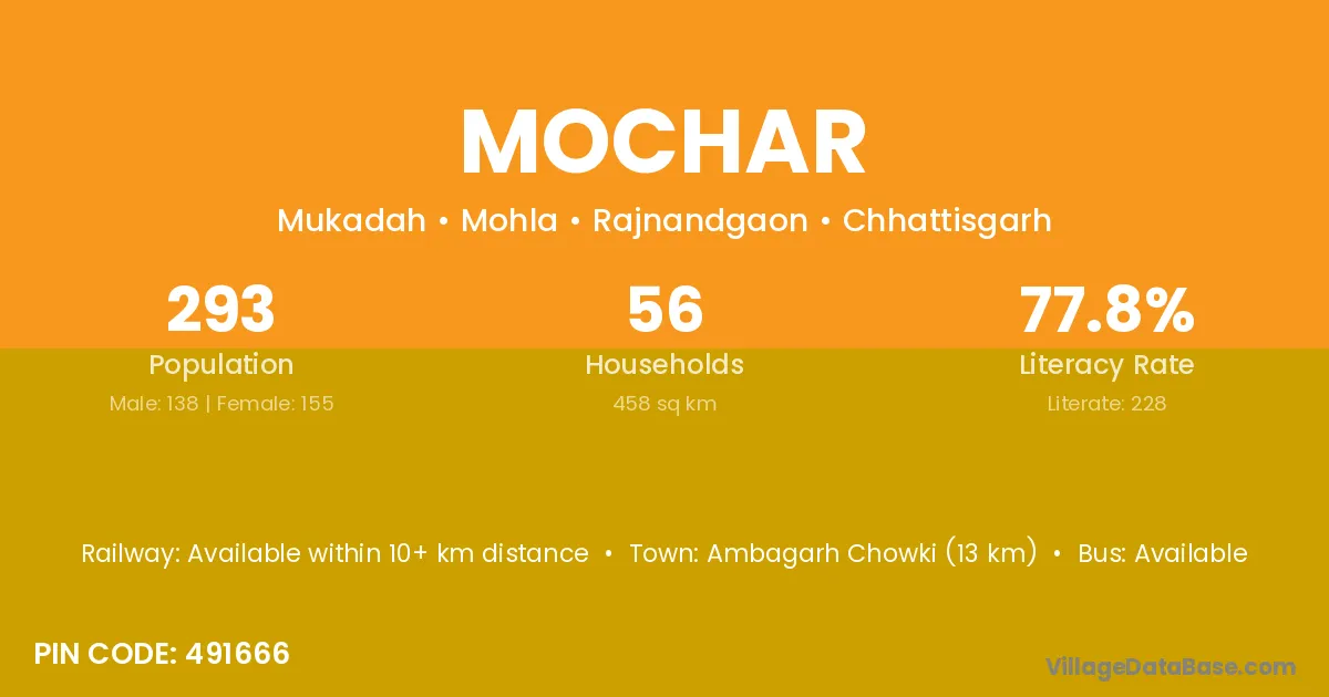 Ambagarh Chowki (13 km) is the nearest town to Mochar village for major economic activities and is located approximately 13 km away.