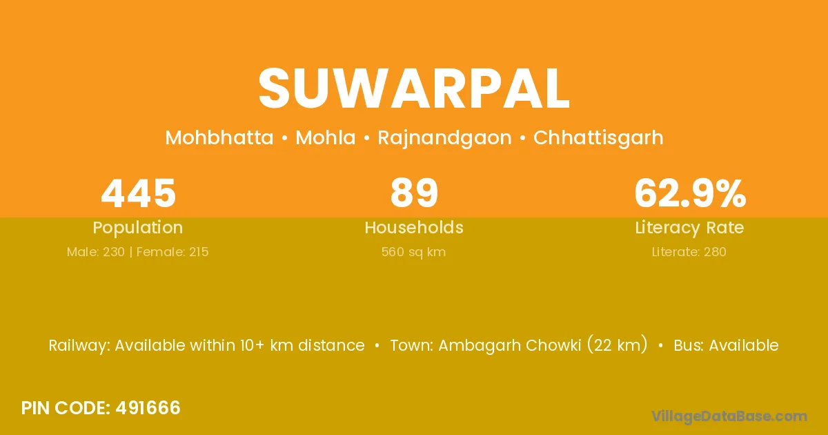 Ambagarh Chowki (22 km) is the nearest town to Suwarpal village for major economic activities and is located approximately 22 km away.