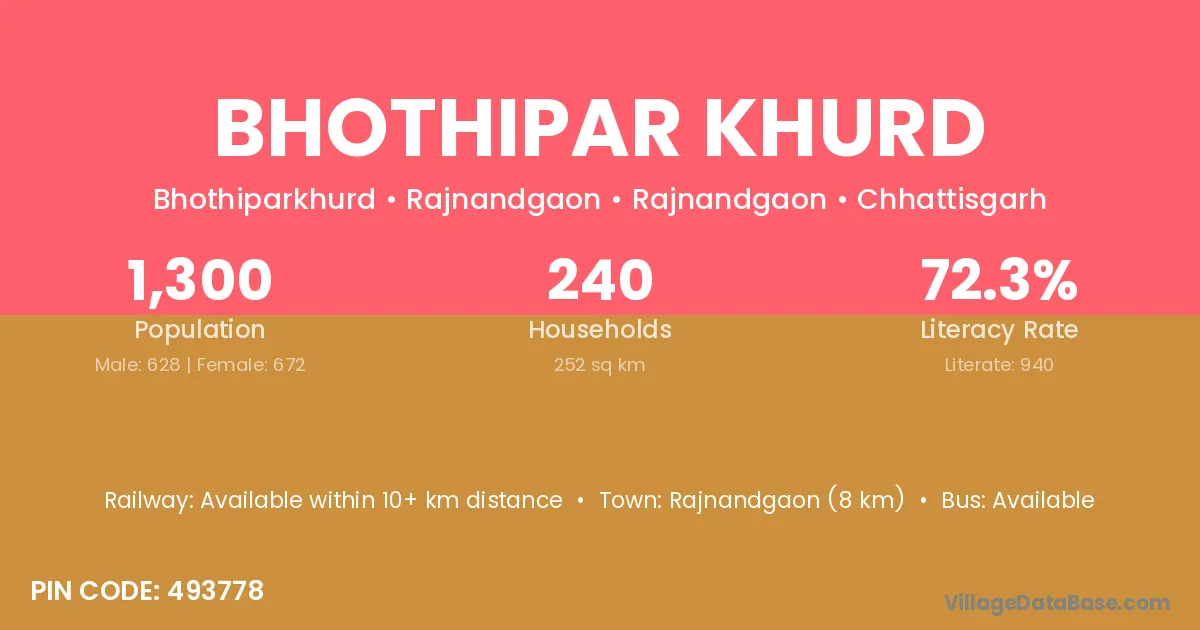 Rajnandgaon (8 km) is the nearest town to Bhothipar Khurd village for major economic activities and is located approximately 8 km away.